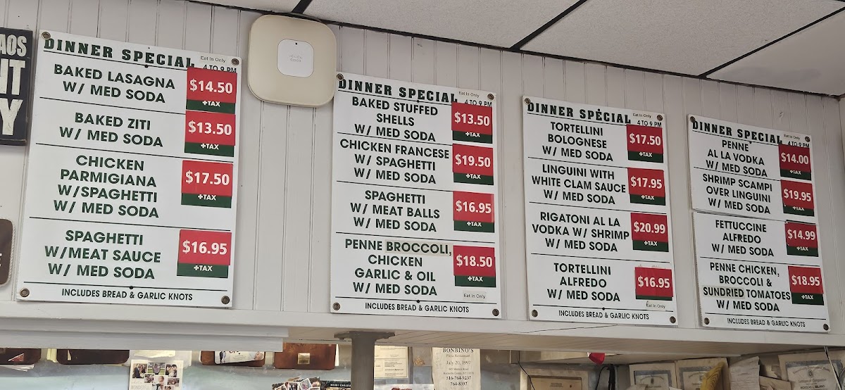 The menu features a diverse selection that caters to every palate. Start with the refreshing Bonbino Salad or the hearty Caesar Salad, ideal for lighter meals. For pizza lovers, the choices are endless—from the classic Regular Cheese Pizza to the indulgent Bonbino's Special, loaded with a medley of toppings. Don't miss the unique specialty pies like the Baked Ziti Pie or Penne Alla Vodka Pie, promising a taste experience that’s truly unforgettable.